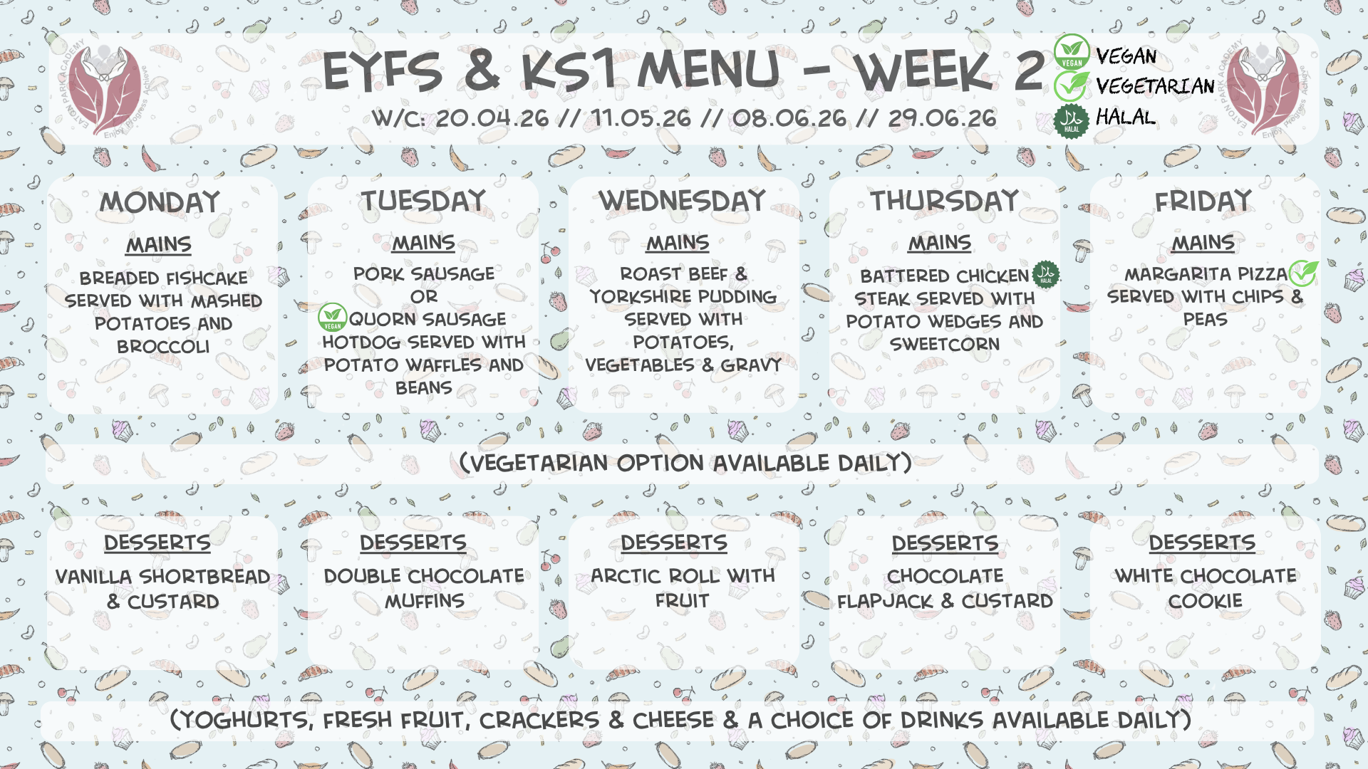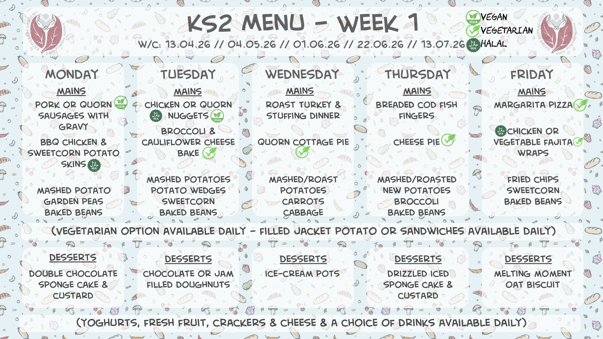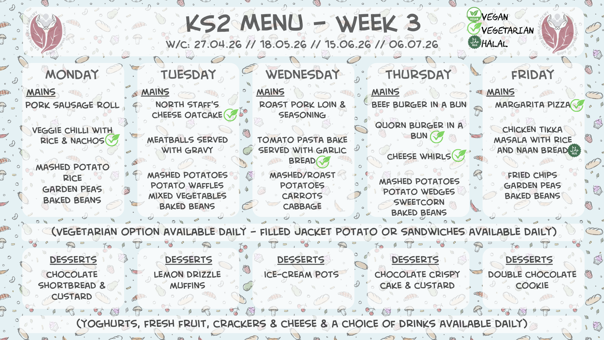 Please see below our lunch menus for EYFS & KS1 and KS2 for the Spring term 2025-2026. We will operate a 3-week cycle of menus for our pupils. The menus will operate on a 3-week cycle, with a different menu each week for EYFS & KS1 and KS2. The dates for each menu can be found at the top of each one below. Should you have any questions about the lunch menus and/or payment, please speak to the office – 01782 234760.
