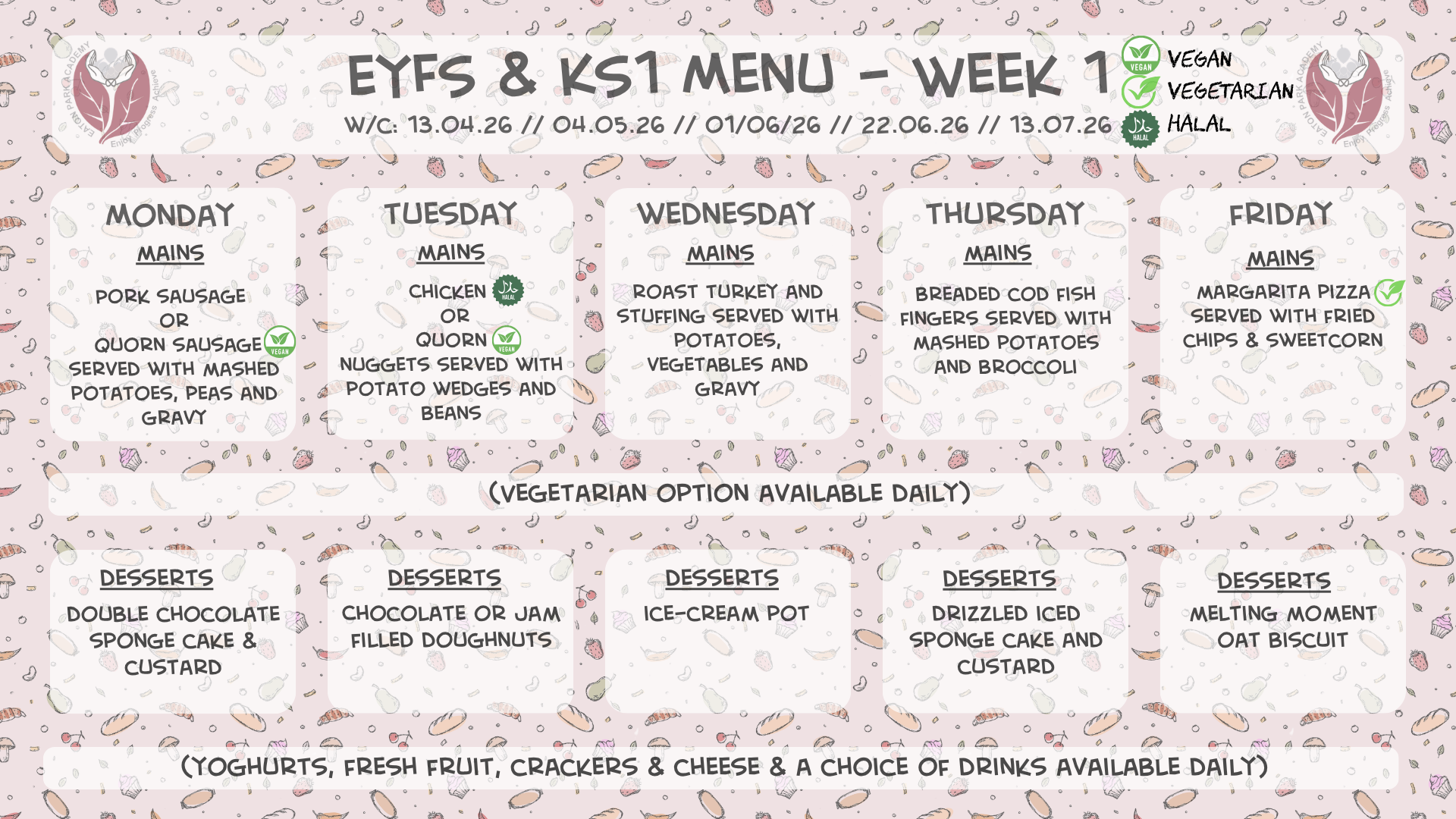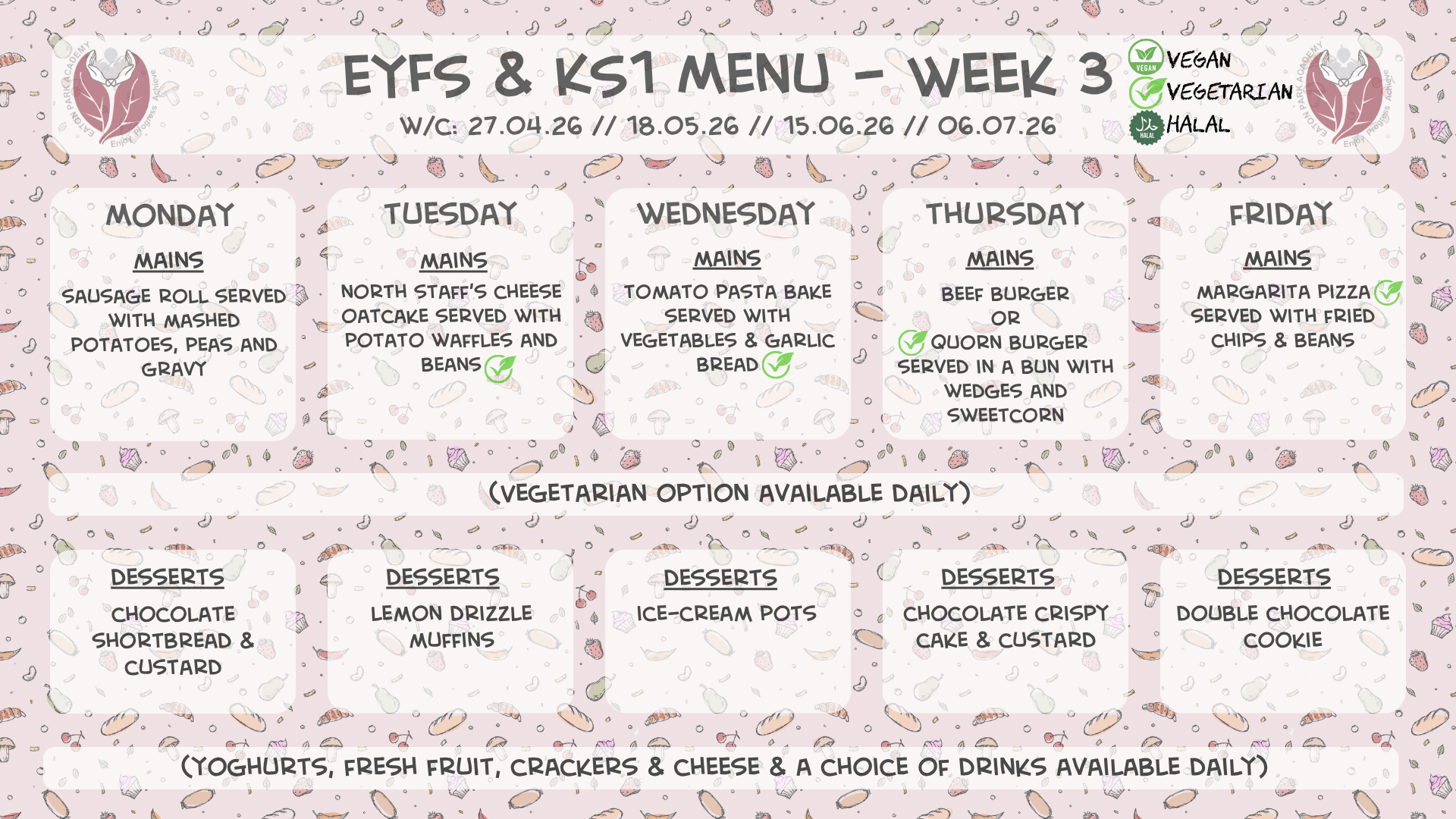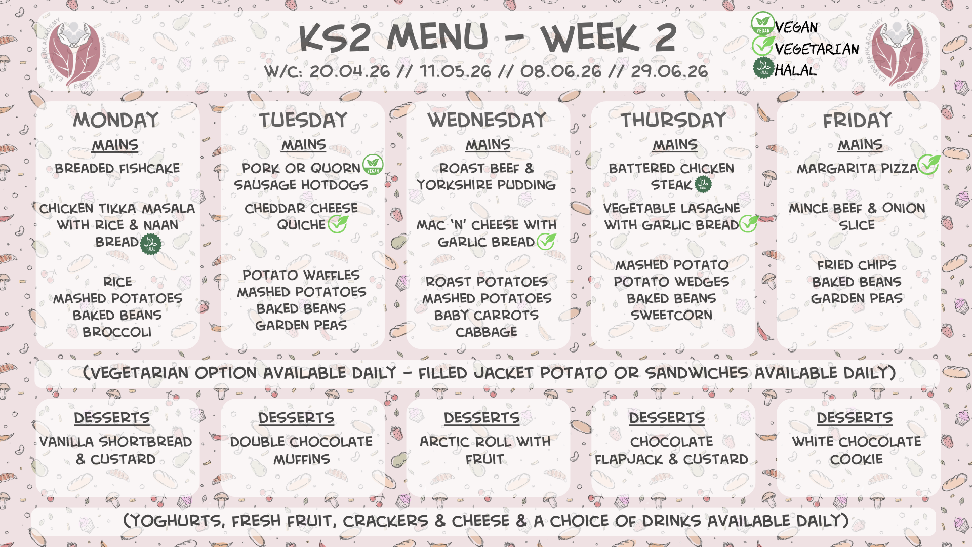 Please see below our lunch menus for EYFS & KS1 and KS2 for the Spring term 2025-2026. We will operate a 3-week cycle of menus for our pupils. The menus will operate on a 3-week cycle, with a different menu each week for EYFS & KS1 and KS2. The dates for each menu can be found at the top of each one below. Should you have any questions about the lunch menus and/or payment, please speak to the office – 01782 234760.